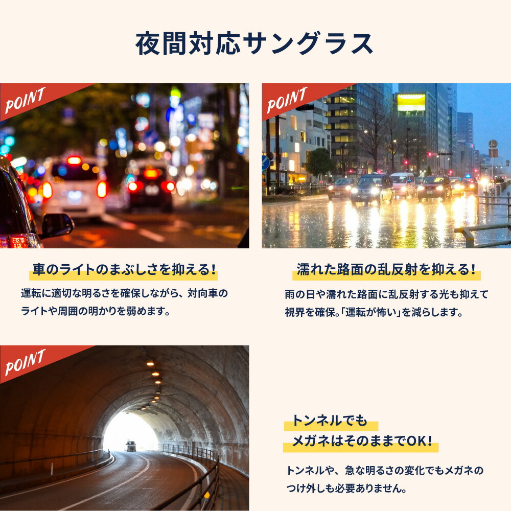 夜間、或いは雨、霧、曇りの天候の際に着用頂くことで 視認性 が良くなります。特に ドライブ の際は標識や信号、歩行者などが見やすくなります。また 夜間の運転にも効果的で、対向車の ライト 、街灯、ネオンなどの強い光を緩和する効果が期待でき、運転の安全性が高いと考えられます。もちろん、日差しの強い日中もお使い頂くことができ、眩しさを低減するとともにし 紫外線 から目を守り(UVカット率は約100%) 眼精疲労 や 眼の疲れ からくる 頭痛 も抑えられたとのお声も頂いております。