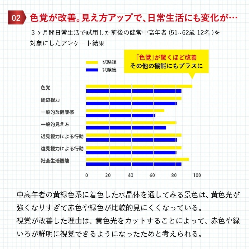 人間の眼の感度が最も高いため、眩しく感じる黄色い光(イエローライト)を、最大70%以上カットする当社オリジナルレンズです。