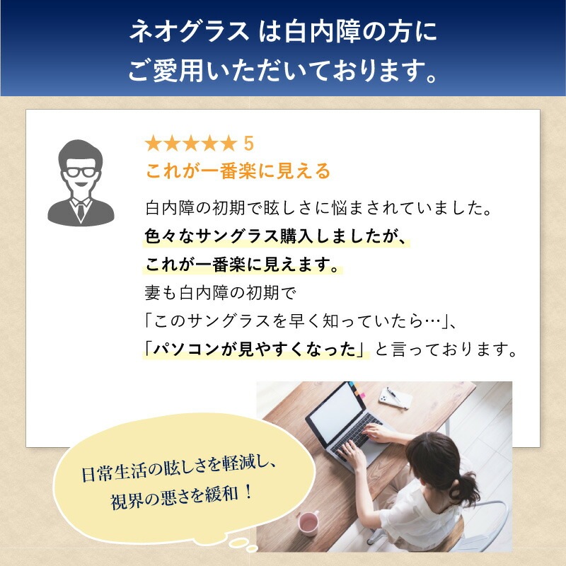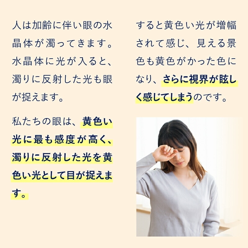 白内障を患う年齢に近づくにつれ、さらに効果的に利用が可能です。日常的に感じる屋内外のまぶしさが低減され、 パソコン や スマホ の利用時にも重宝します。