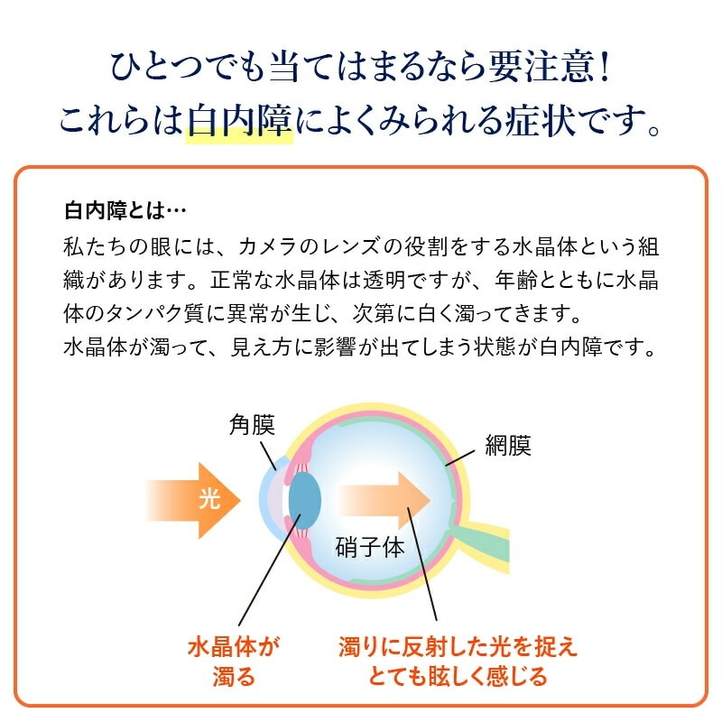 加齢 とともに進行する 白内障症候群 眼の水晶体が濁ってくると、濁りに反射した光も眼が捉えてしまいます。